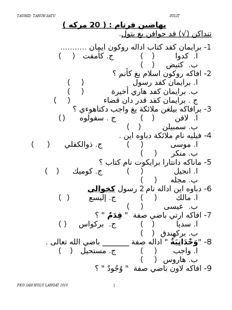 Soalan Tauhid Darjah 1 Sekolah Agama Johor